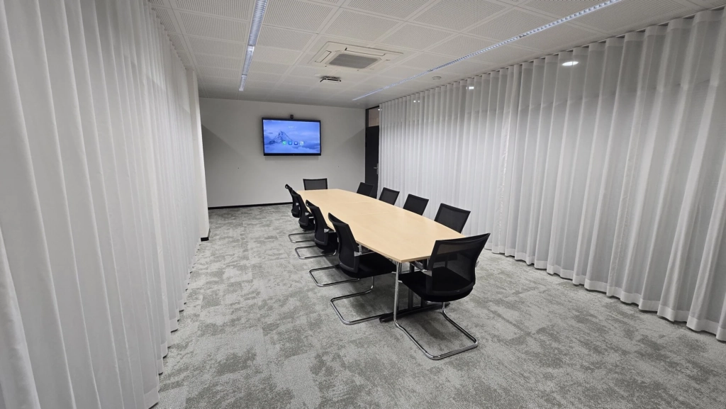 Ausstattung: Der Raum bietet eine moderne und funktionale Umgebung für produktive Meetings. Ausgestattet mit grossem Bildschirm, Videocall-System und einem Flipchart, ist er ideal für Präsentationen, Workshops oder hybride Besprechungen.